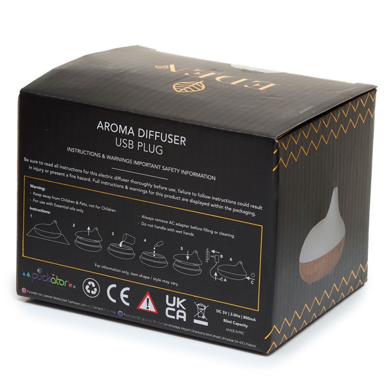 - Product Instructions: The product comes with all parts included. This product comes complete with full use, care and safety instructions, please read before use. Only for use with water and essential oils, do not use any other liquids. The diffuser holds a maximum of 80ml of liquid, do not overfill, and do not refill while in use.
