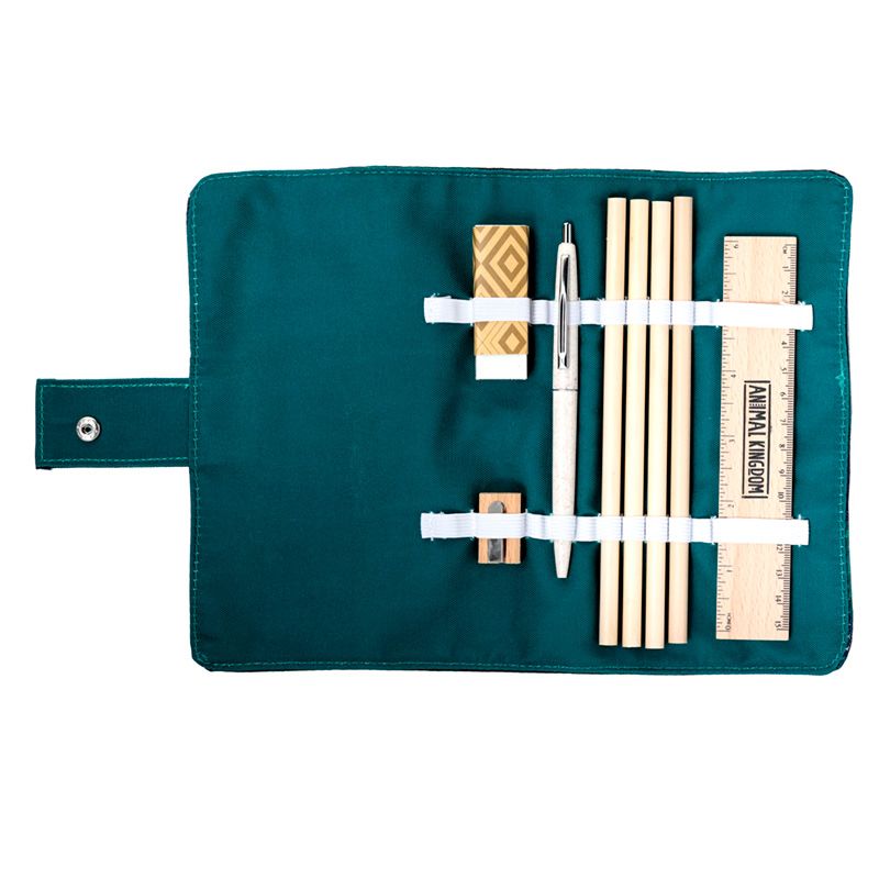 - Material: RPET Recycled Bottles Plastic Wrap, Metal Popper, Wooden Ruler and Sharpener, Wheat Straw Pen and Rubber Eraser